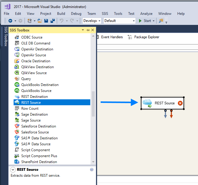 - In the SSIS Toolbox, locate the Salesforce Source component and drag it onto the Data Flow canvas.