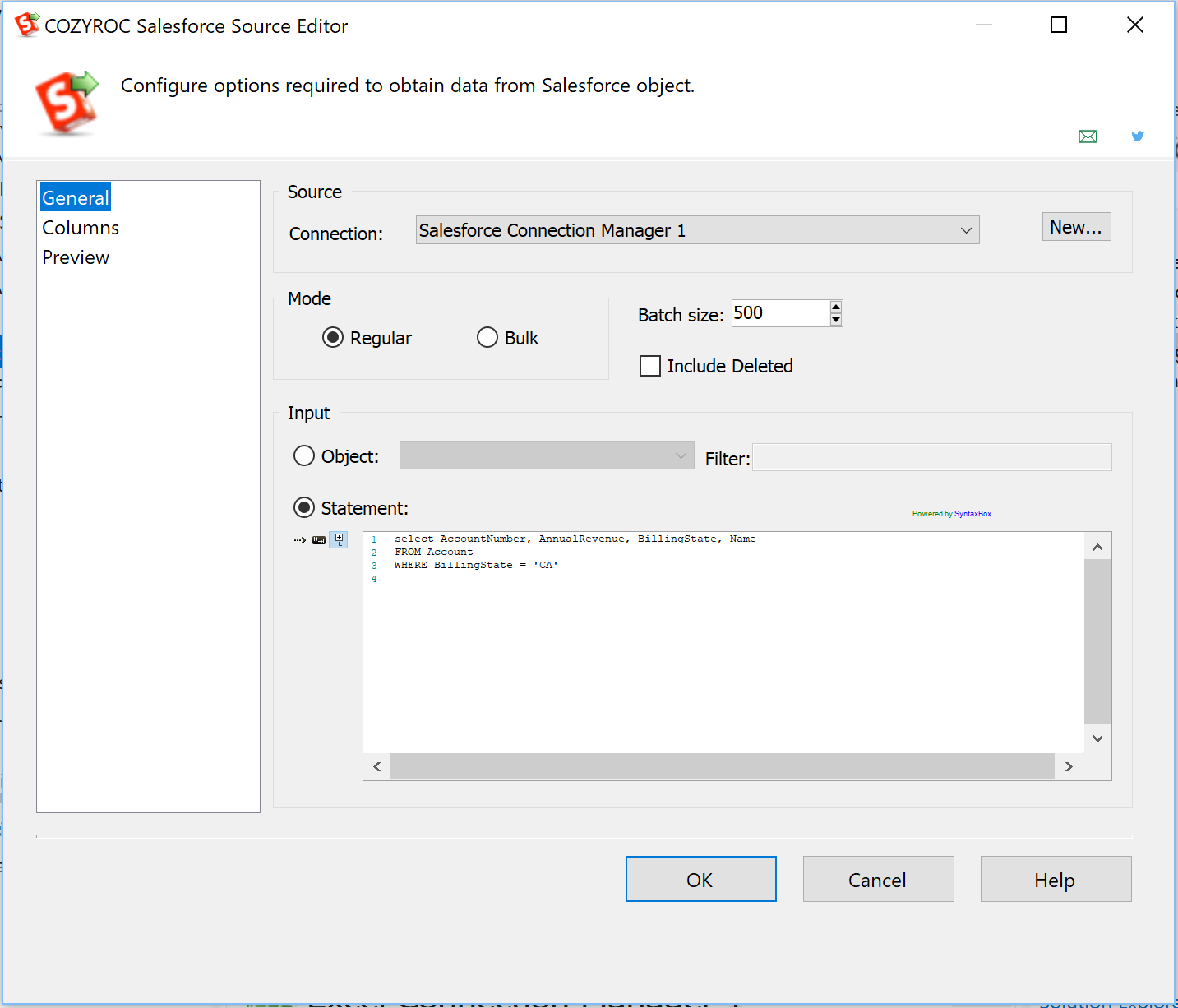 In this guide, we will show how to read data from the Salesforce CRM Analytics service resource using the COZYROC REST Source component.
