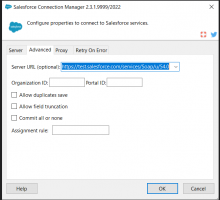 Use the Advanced page of the Salesforce Connection Manager dialog to to specify additional properties for your connection to the Salesforce service.