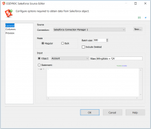 Salesforce Connection Manager is SSIS Connection Manager for establishing Salesforce connections. Use the API to build components based on Salesforce Connection Manager.